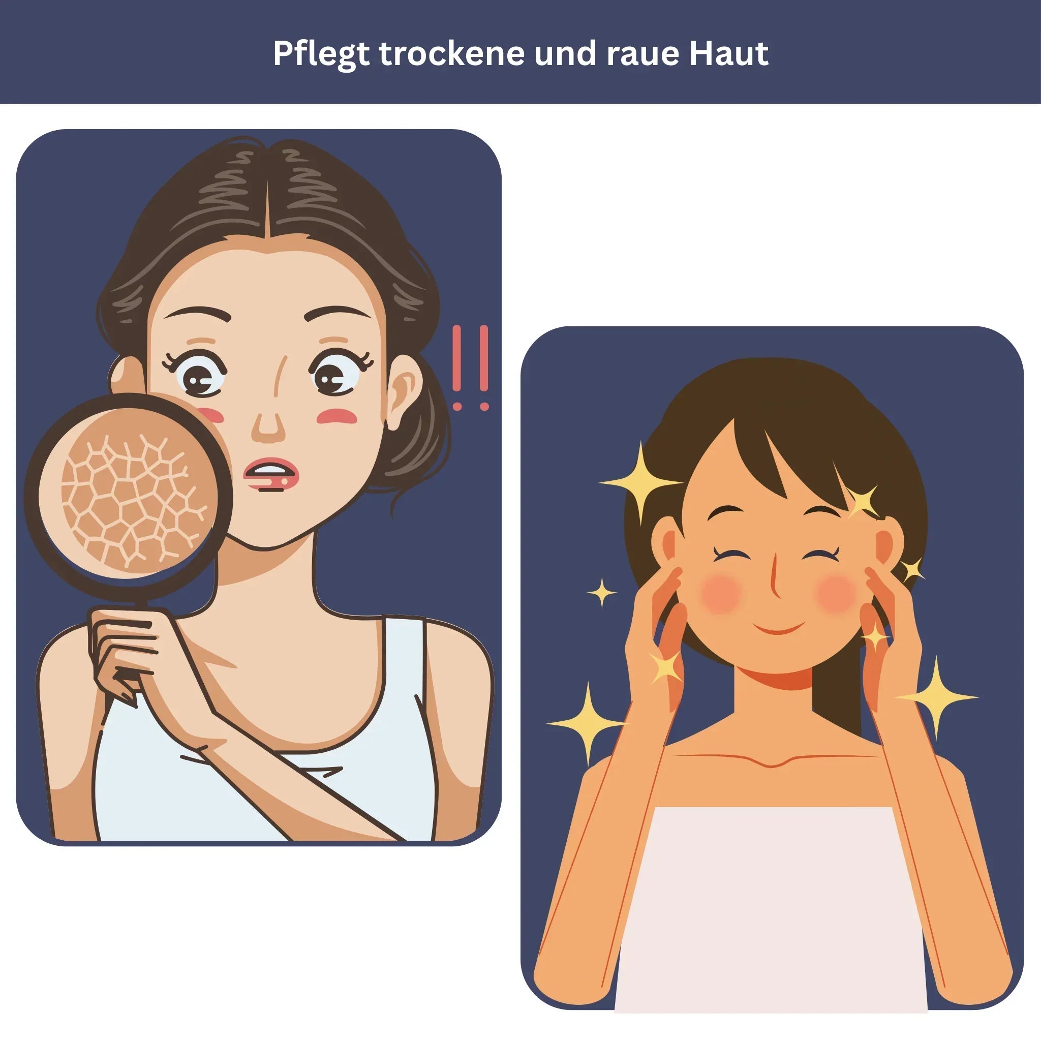 Sie spendet tiefgehende Feuchtigkeit, glättet trockene und raue Haut, stärkt die Hautbarriere und unterstützt die Regeneration. Gleichzeitig wirkt sie Anti-Aging, verleiht der Haut Geschmeidigkeit und einen gesunden, strahlenden Glow.
