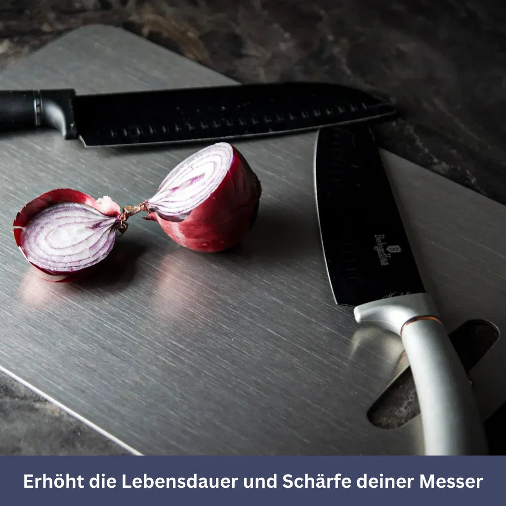 Das TitanElite Schneidebrett schont deine Messer, da Titan weicher als Stahl ist und die Klingen beim Schneiden nicht abnutzt.