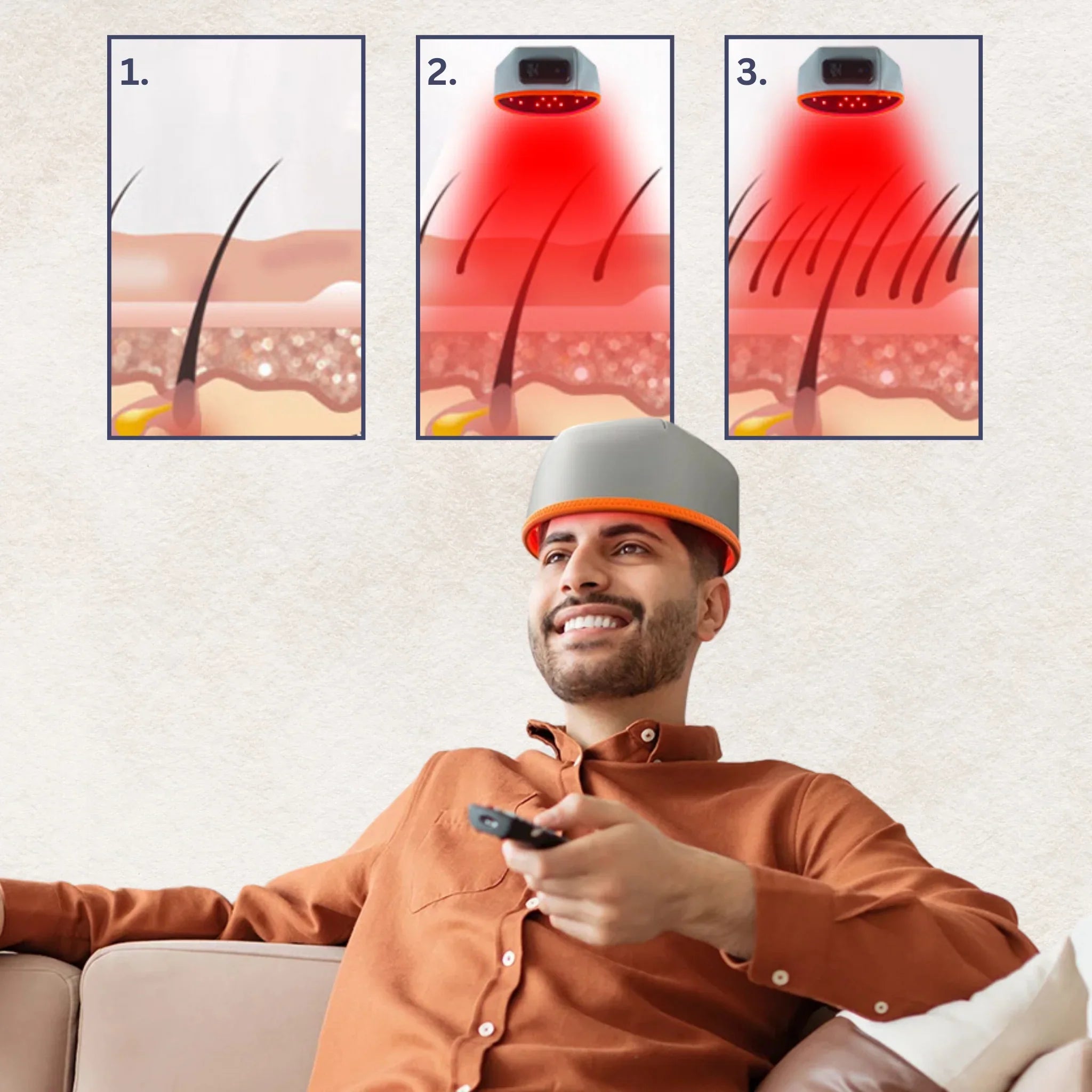 Die HairRevive Lichttherapie-Mütze verwendet fortschrittliche Rotlicht- und Infrarot-Technologie, um tief in die Kopfhaut einzudringen und Haarfollikel zu aktivieren für volleres und gesünderes Haar.