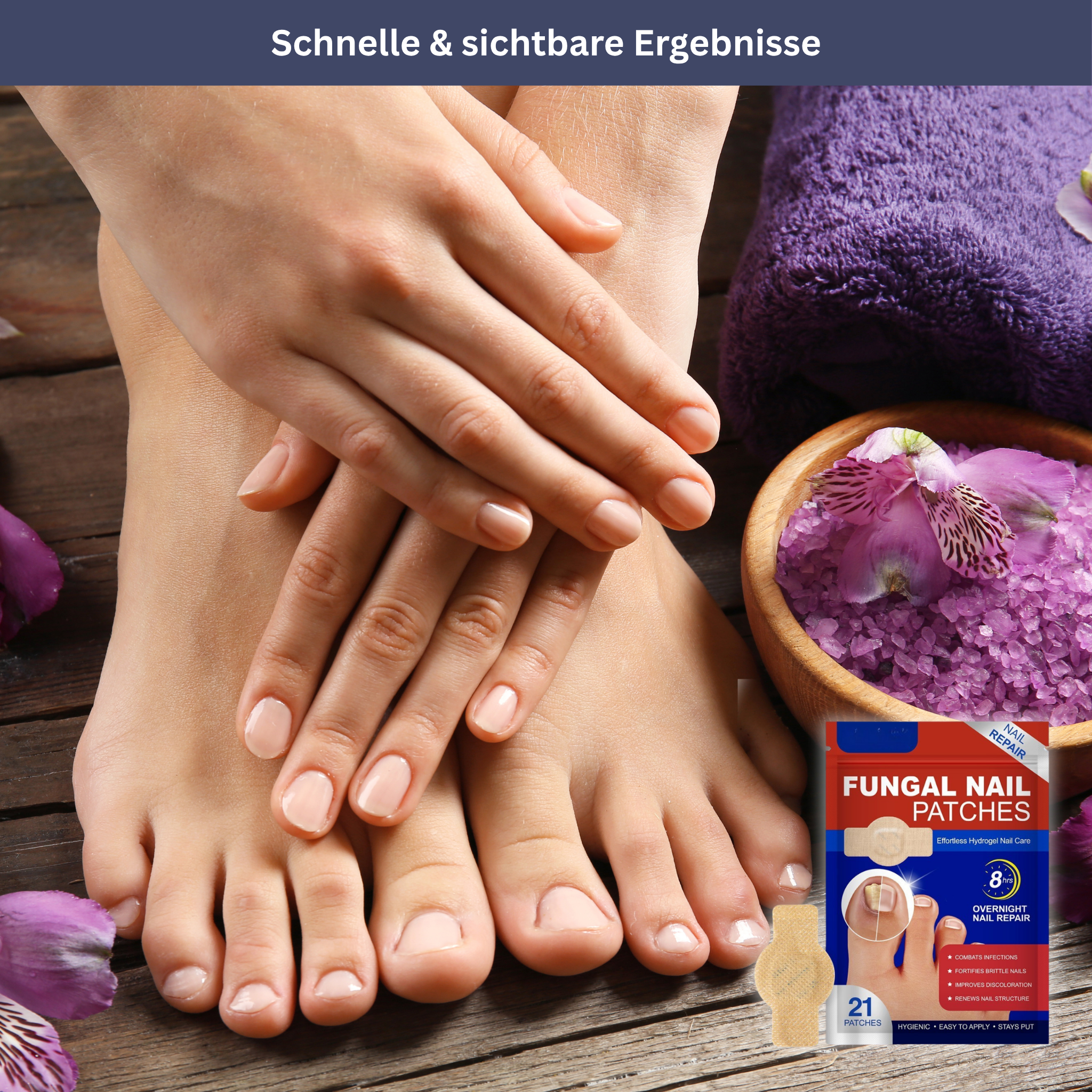 Unsere wirkungsvolle Nagelpflege hilft dir, glatte, klare und starke Nägel zurückzugewinnen – damit du deine Hände und Füße wieder selbstbewusst zeigen kannst.