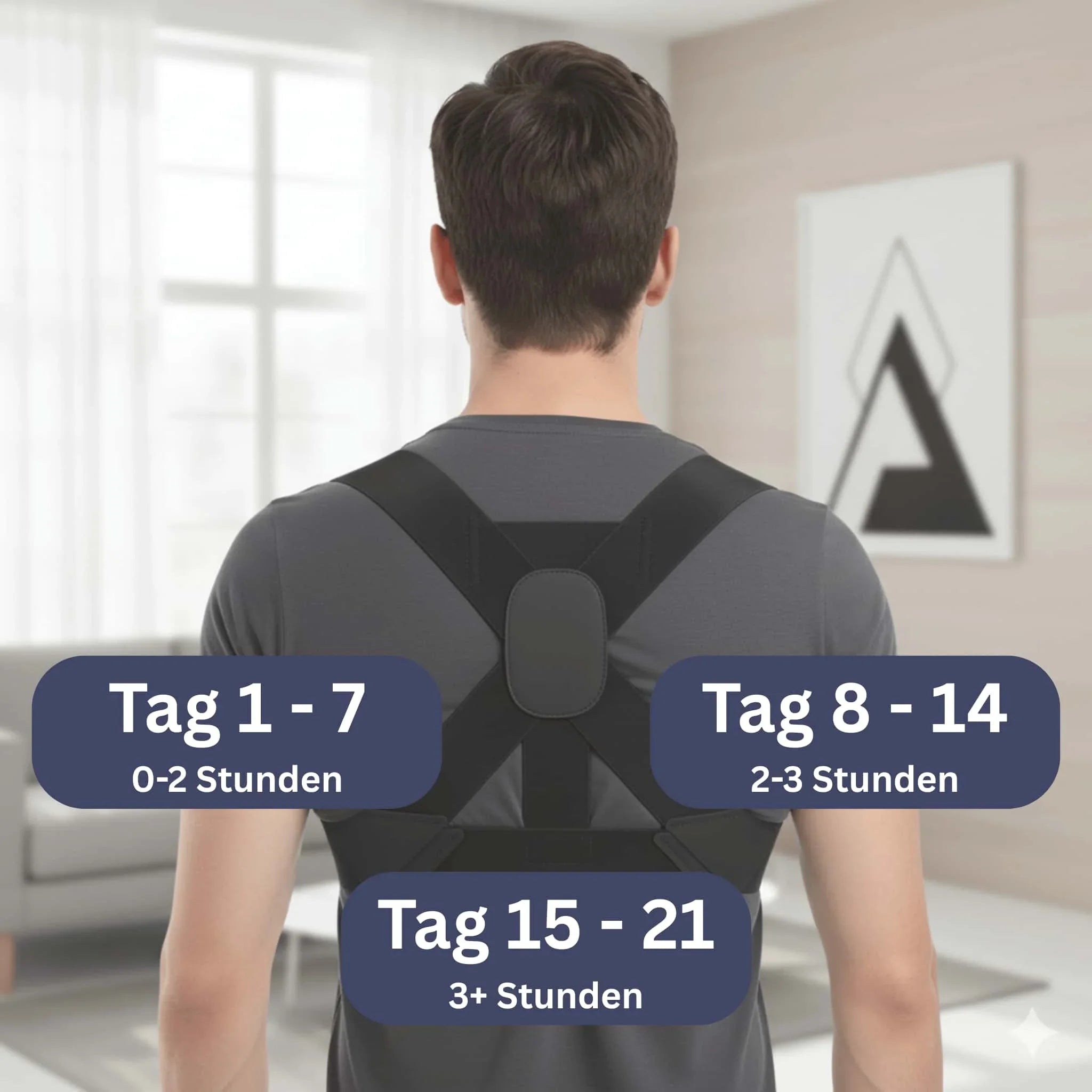 Nach wenigen Wochen kannst du die Tragezeit verlängern und den Rückenhalter fest in deinen Alltag integrieren, um langfristig Rückenbeschwerden zu reduzieren.