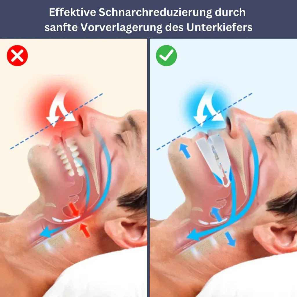 Durch die sanfte Vorverlagerung des Unterkiefers wird der Rachenbereich geöffnet, was zu einer deutlichen Reduzierung der Schnarchgeräusche führt.