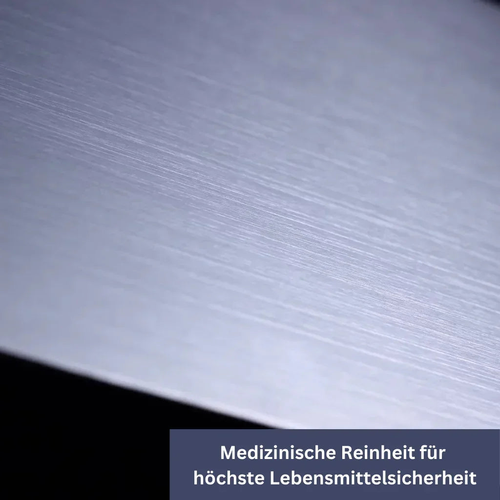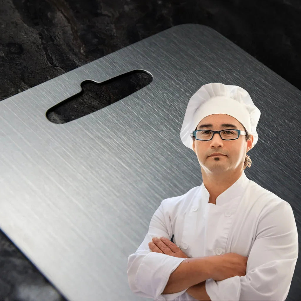 Hergestellt aus 100% Edelstahl, vereint dieses Schneidebrett Haltbarkeit und hygienische Vorteile und übertrifft herkömmliche Schneidebretter in jeder Hinsicht.