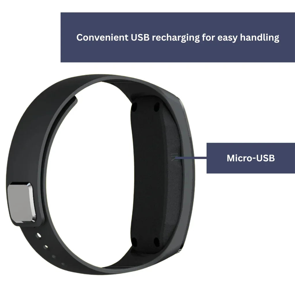 With 360° ultrasonic waves, the bracelet repels mosquitoes without harmful ingredients.