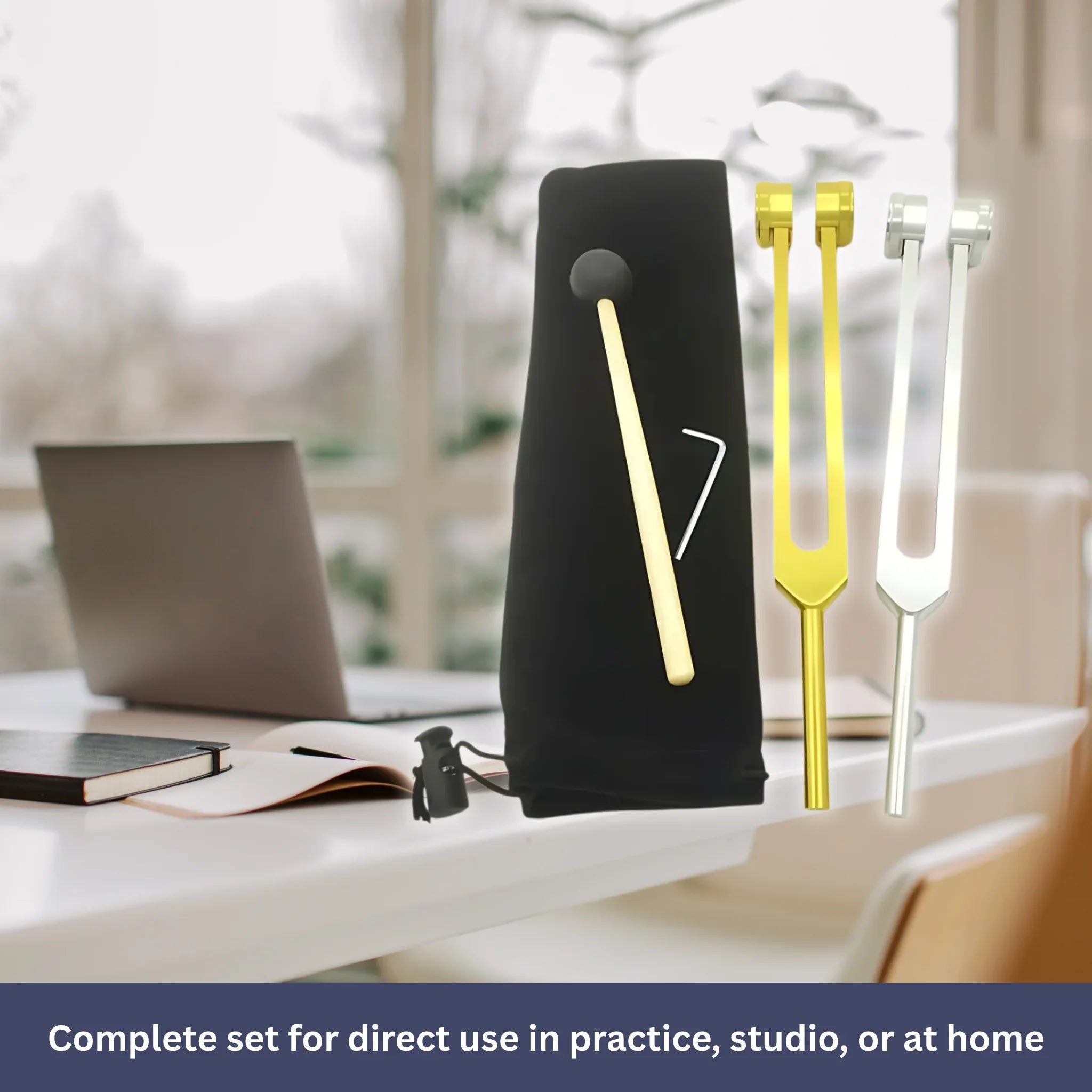 The set includes a precisely tuned tuning fork (128 Hz), a wooden striker for activation, and an elegant leather case for safe storage.